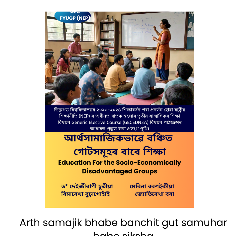 "Education for the Socio-Economically Disadvantaged Groups" by Dr. Daisy Rani Chutia is an insightful and policy-aligned textbook designed for the 3rd Semester Generic Elective Course (GECEDN3A) under the FYUGP NEP framework of Dibrugarh University.ড° ডেইজি ৰাণী চুতীয়া ৰ দ্বাৰা ৰচিত "অৰ্থ-সমাজিকভাৱে বঞ্চিত গোটসমূহৰ বাবে শিক্ষা" গ্ৰন্থখন FYUGP NEPৰ অধীনত ডিব্ৰুগড় বিশ্ববিদ্যালয়ৰ ৩য় ছেমিষ্টাৰৰ "Generic Elective" পাঠ্যক্ৰম (GECEDN3A) অনুসৰি প্ৰস্তুত কৰা হৈছে।