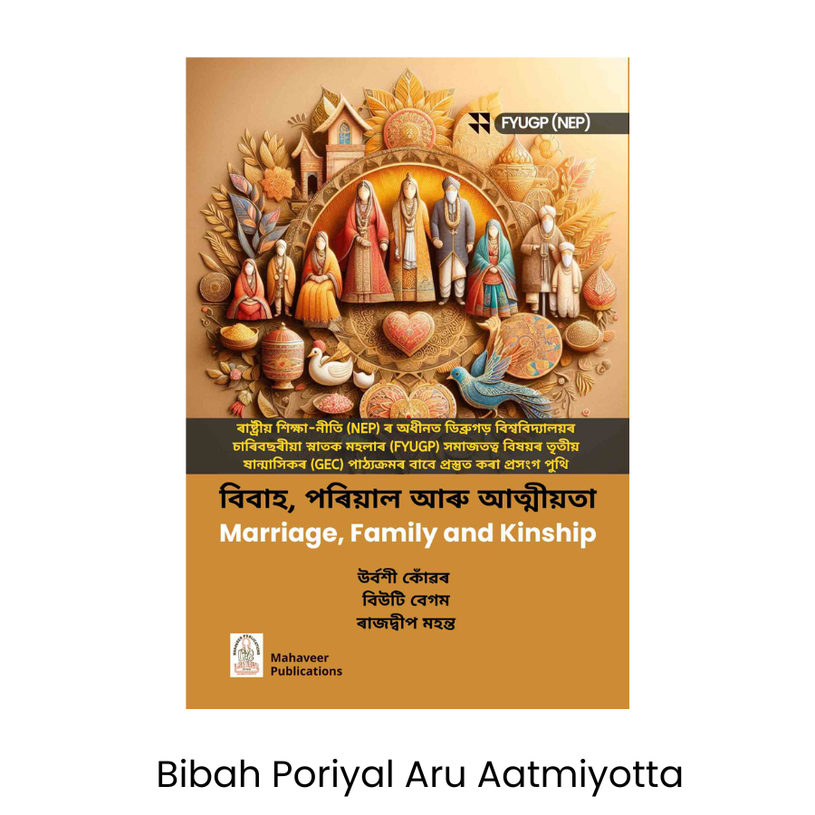 "Bibah Poriyal Aru Aatmiiyota" authored by Urvasi Konwar is a comprehensive textbook for BA 3rd Semester (GEC) students under the FYUGP NEP syllabus of Dibrugarh University. Published by Mahaveer Publications, this book delves into the sociological concepts of marriage, family, and kinship in the Indian context with a special emphasis on Assamese society. It offers critical insights into traditional and contemporary familial structures, relationships, and social bonds. The content is designed to help students grasp theoretical frameworks as well as practical implications, making it an essential resource for students of sociology and social sciences following the NEP guidelines.